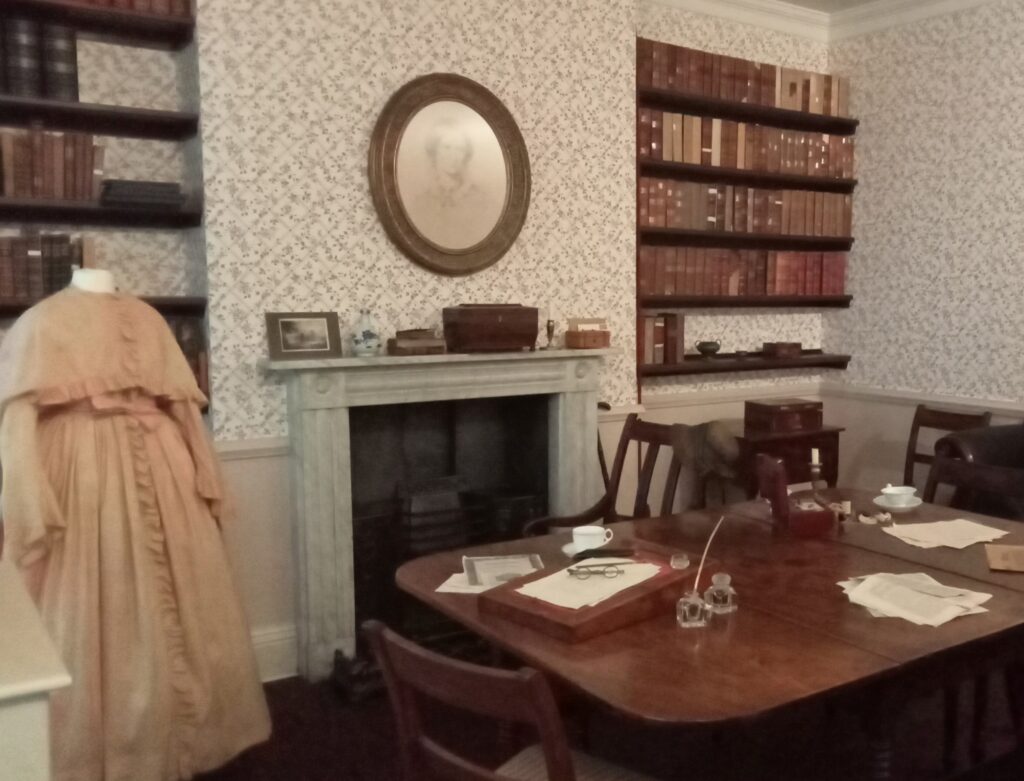 The back is completely changed, thanks to Revd Wade (!) but there is enough left of the kitchen to be able to put yourself into the Brontës’ shoes and imagine it as it was. The view of the graveyard is somewhat grim (and it is reputed to contain over 40,000 bodies!), but you can’t help feeling that it was influential in their writings, and perhaps a constant reminder that life is fleeting. Patrick, their father, had a fear of fire and while they were growing up, there were no carpets or curtains to provide warmth and some degree of insulation from the stone flagged floors. (This changed eventually as Charlotte managed to persuade him to accept a few more comforts.) If you can visit when it’s not busy, you can stand in the stone flagged entrance hall and imagine the family are there with you. The dining room and Patrick’s study are pretty much as they were in the Brontës’ time, although the kitchen has been much altered. You can see the original table and sofa in the dining room (below): the sisters used to write here, read pieces out to each other, and walk round the table arm in arm chatting. The pink wrapper on the left was part of a special exhibition of some of Charlotte’s clothes and would have been worn by her inside the house.