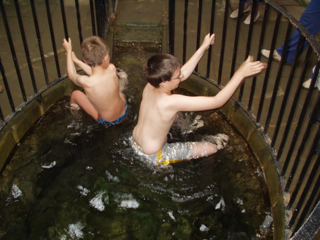Although the springs which supply this Georgian bath house are thought to have been used since antiquity (The Northern Antiquarian’s website, https://megalithix.wordpress.com/2008/09/12/white-wells-ilkley/, states this, and also that the springs originally emerged higher up the hill) the house itself is relatively modern. The original structure is thought to date from around 1690, but what we see today is the version enlarged and improved by William Middleton, the local squire, arounf 1780. The Roman style plunge pool can be seen today and occasionally, (usually New Year’s Day and Yorkshire Day , August 1st) the public can take the plunge! Be warned though, the water is always chilly as it comes out of the earth at a constant temperature (variously said to be between 4.5 and 7 degrees Celsius!). Our sons gave it a go on Yorkshire Day back in 2004… they were canny enough to not dunk completely!
